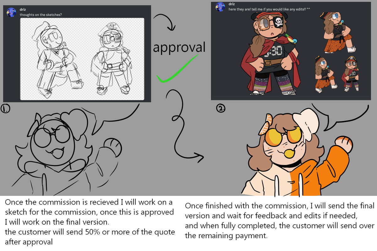 Directly DM me on any of my socials asking for a commission with a reference picture and size and you will get a quote. If you accept the quote you will acknowledge it. A WIP/sketch will be sent over for you to check my progress. Send at least half the quote to my buy me a coffee for continuation. You an suggest changes until you're satisfied and then I will finish it up and send it over where you can suggest changes until you are satisfied. Then if you didn't send the full amount upfront, you will send the rest.
